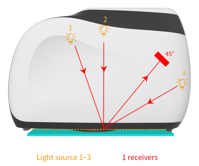 | 측정 기하학 | 3개의 측정 각도 (3개의 조명 소스, 1개의 수신기) |