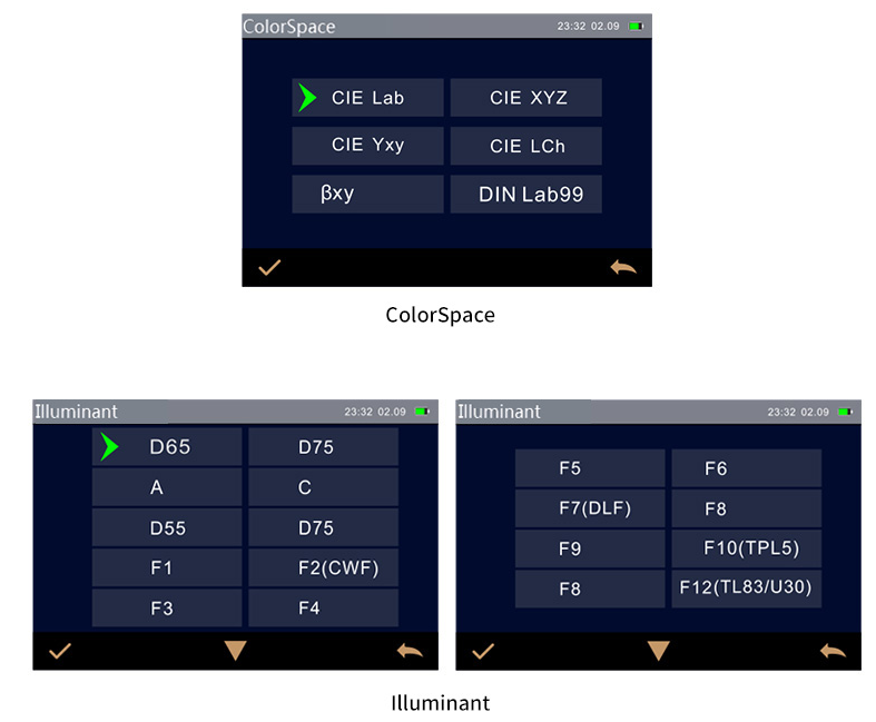 CIE LAB, XYZ, Yxy, LCh, βXY, DIN Lab99 색 공간과 D65, A, C, D50, D55, D75, F1, F2(CWF), F3, F4, F5, F6, F7(DLF), F8, F9, F10(TPL5), F11(TL84), F12(TL83/U30) 등 다양한 광원을 제공하여 다양한 측정 조건에서의 특수 측정 요구 사항을 충족할 수 있습니다.