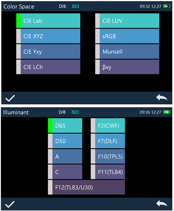 | 색상 차이 공식 | ΔE*ab,ΔE*uv,ΔE*94,ΔE*cmc(2:1),ΔE*cmc(1:1),ΔE*00, DINΔE99,ΔE(Hunter) |